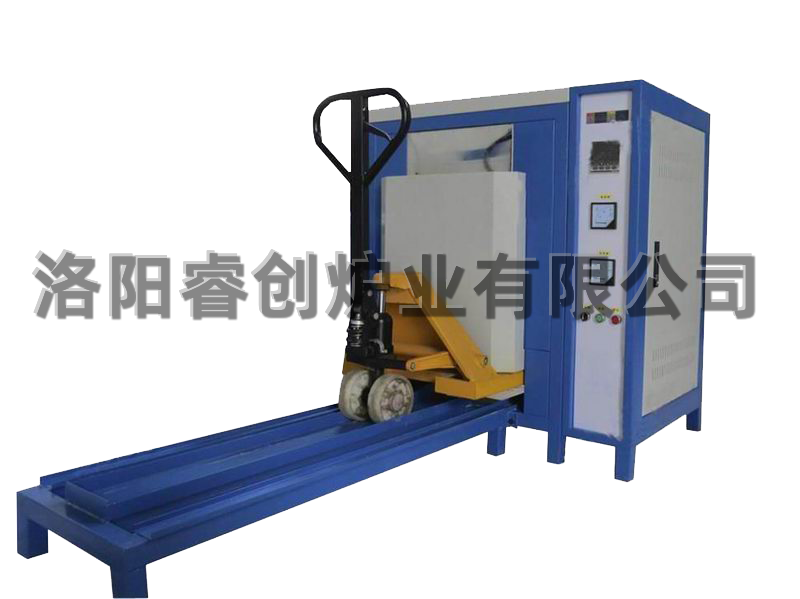 台车由耐火材料砌体、车架和行走机构组成。台车上部耐火材料砌体能够承受炉内高温和工件的载荷。车架在耐火材料砌体向下热传导的影响下,要具有很好的强度和刚度,车架一般由型钢焊接的横梁和纵梁组成,横梁上铺钢板和边框,便于砌筑耐火材料。两侧安装密封刀,在工作时和炉体形成密封。行走机构安装在车架纵梁上,有滚柱带、车轮等形式,行走机构的形式和牵引机构密切相关。